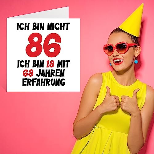 - Hazte reír con esta divertida tarjeta de cumpleaños. Esta tarjeta de cumpleaños excepcional para él o ella muestra el diseño «ICH NO SOY 86 YO SOY 18 CON 68 AÑOS DE EXPERIENCIA». Si estás buscando tarjetas de cumpleaños divertidas para mujeres, esta tarjeta de cumpleaños seguramente te hará reír. No solo regalos de amistad para mujeres, sino también para hijo, hija, novio, hermano, hermana, prima, tía o tío.