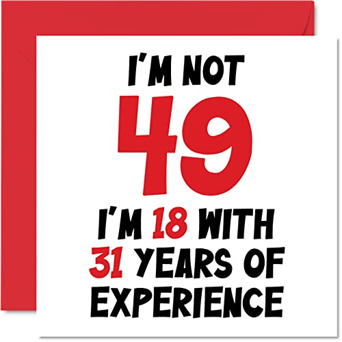 - Hazlos reír con esta divertida tarjeta de cumpleaños: esta tarjeta de cumpleaños de calidad excepcional para ella o él muestra el diseño I’m Not 49, I’m 18 With 31 Years Experience. Si estás buscando tarjetas de cumpleaños divertidas para mujeres, entonces esta tarjeta de feliz cumpleaños número 49 seguramente las hará reír. No solo para regalos de amistad para mujeres, también podría ser para mamá, papá, mejor amigo, compañero de trabajo, hermano, hermana, primo, tía o tío.